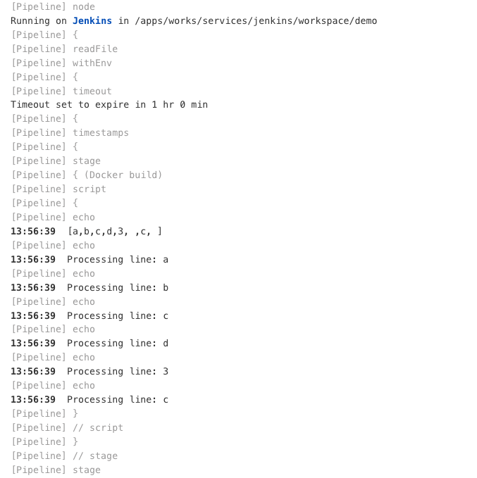 pipeline { agent any options { timeout(time: 60, unit: 'MINUTES') //SECONDS, MINUTES, HOURS timestamps () } environment { fileContent = readFile '/apps/works/data/deploy' } stages { stage('Docker build') { steps { script { //def file = readFile '/apps/works/data/deploy' //def lines = file.readLines().findAll { it.trim() != '' } //def lines = file.readLines() def lines = fileContent.readLines() echo "$lines" for (line in lines){ def items = line.split(',').findAll { it.trim() != '' } for (item in items) { echo "Processing line: ${item}" } } } } } stage('k8s deploy') { steps { sh 'echo "k8s yml"' script { def lines = fileContent.readLines() for (line in lines){ //portserver(item) def items = line.split(',').findAll { it.trim() != '' } for (item in items) { echo "Processing line: ${item}" } } } } } } }