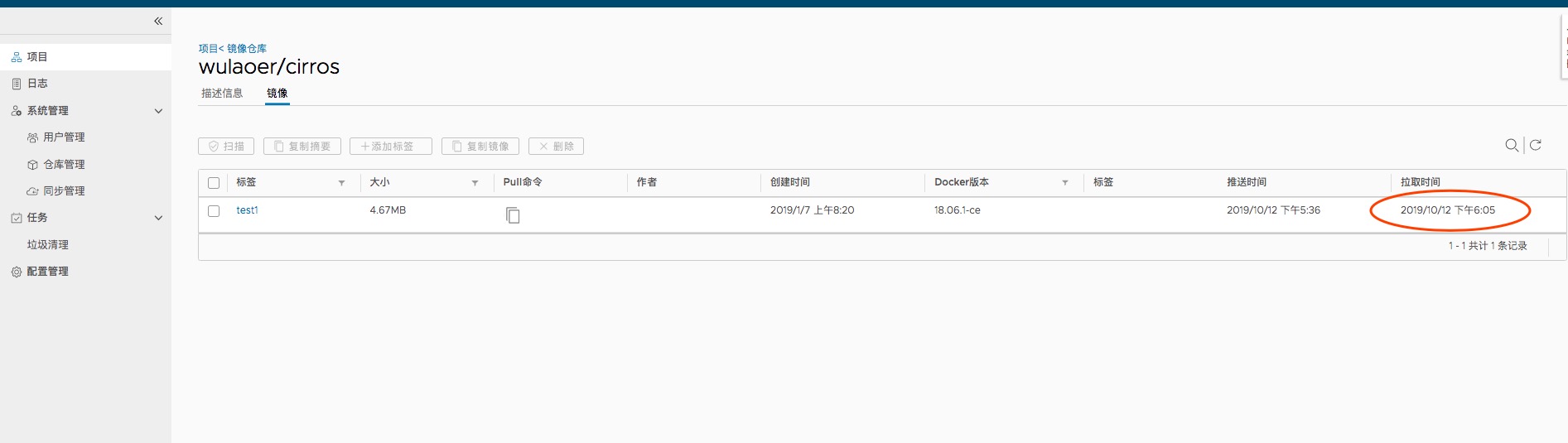 [root@wulaoer harbor]# docker push 10.211.55.41/wulaoer/cirros:test1 The push refers to repository [10.211.55.41/wulaoer/cirros] abbd6d6ac643: Pushed 75b99987219d: Pushed 0cc237193a30: Pushed test1: digest: sha256:96137d51e0e46006243fa2403723eb47f67818802d1175b5cde7eaa7f19446bd size: 943