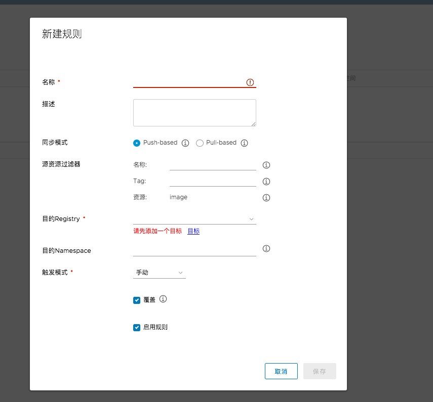 在名称中创建规则名字,可以简单做一个描述。同步方式有两种一种是推送一种拉取,根据主和被选择,源资源过滤器根据需求选择不通的tag和名称。注意目的Registry中需要在仓库管理中选择一个需要同步的目标harbor连接信息。可以选择触发方式等。