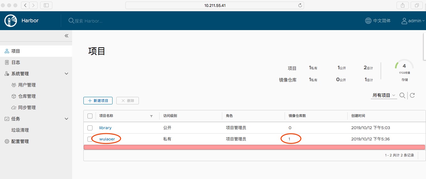 使用浏览器登录Harbor,查看一下wulaoer项目下是否有镜像文件存在,如果有说明推送成功,没有就推送失败,使用命令登录后在推送一次。
