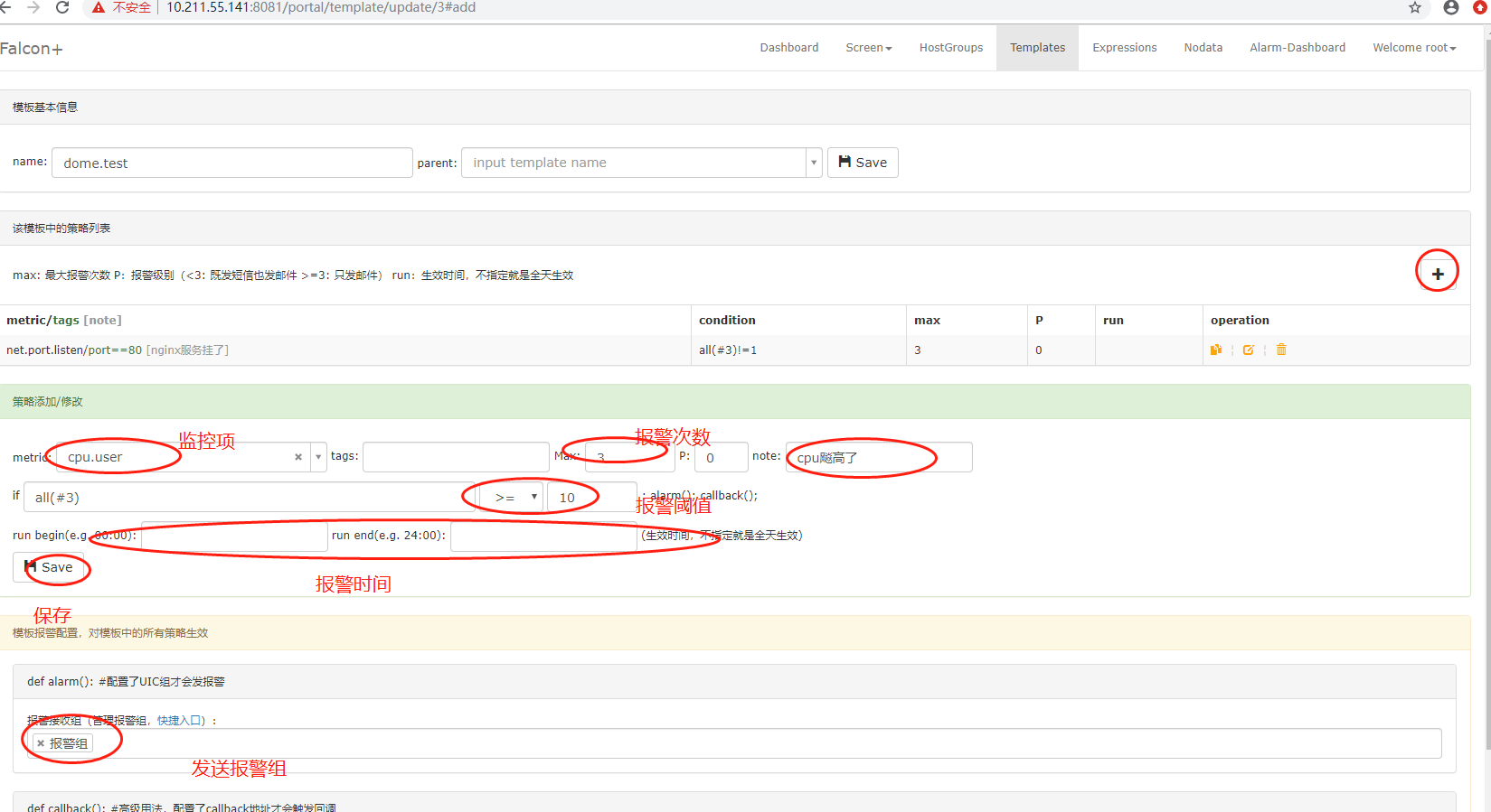 Open-Falcon模板创建是为了监控报警的指标,客户端只是传输数据,并不判断判断的数据是否属于需要报警状态,这就需要使用模板自己定义,监控的数据什么时候才是需要报警的状态,什么时候不是报警的状态了,报警之后发送给谁,是使用邮件发送还是使用钉钉或者微信等等。在没有创建模板之前先创建报警组
