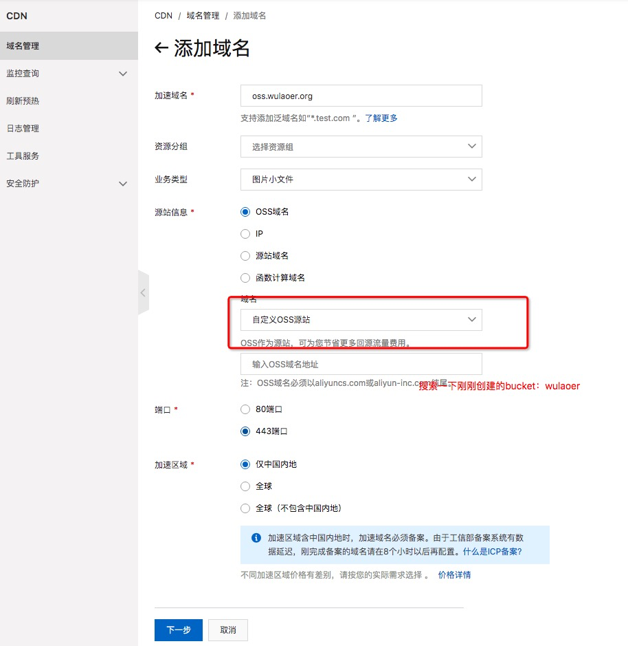 点击确定就会创建一个名称为wulaoer的bucket,oss创建好了,下面给这个oss加cdn。在阿里云的cdn中