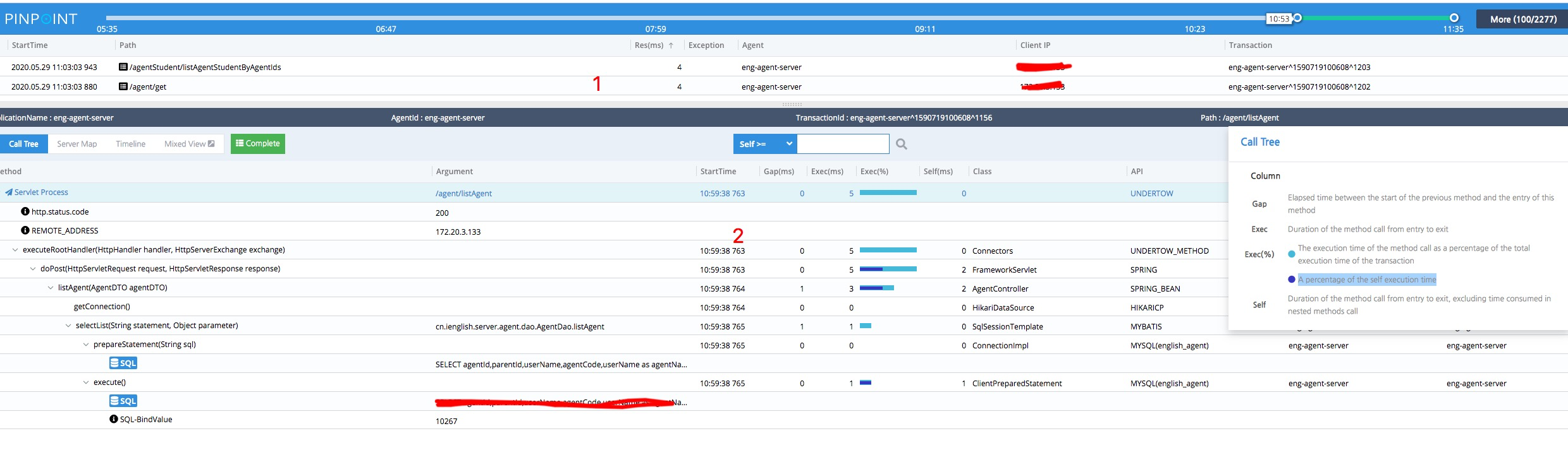 1、是请求的url,所在服务器的IP,pinpoint客户端定义的server名称以及时间。 如果有错误的请求,在Exception栏有一个