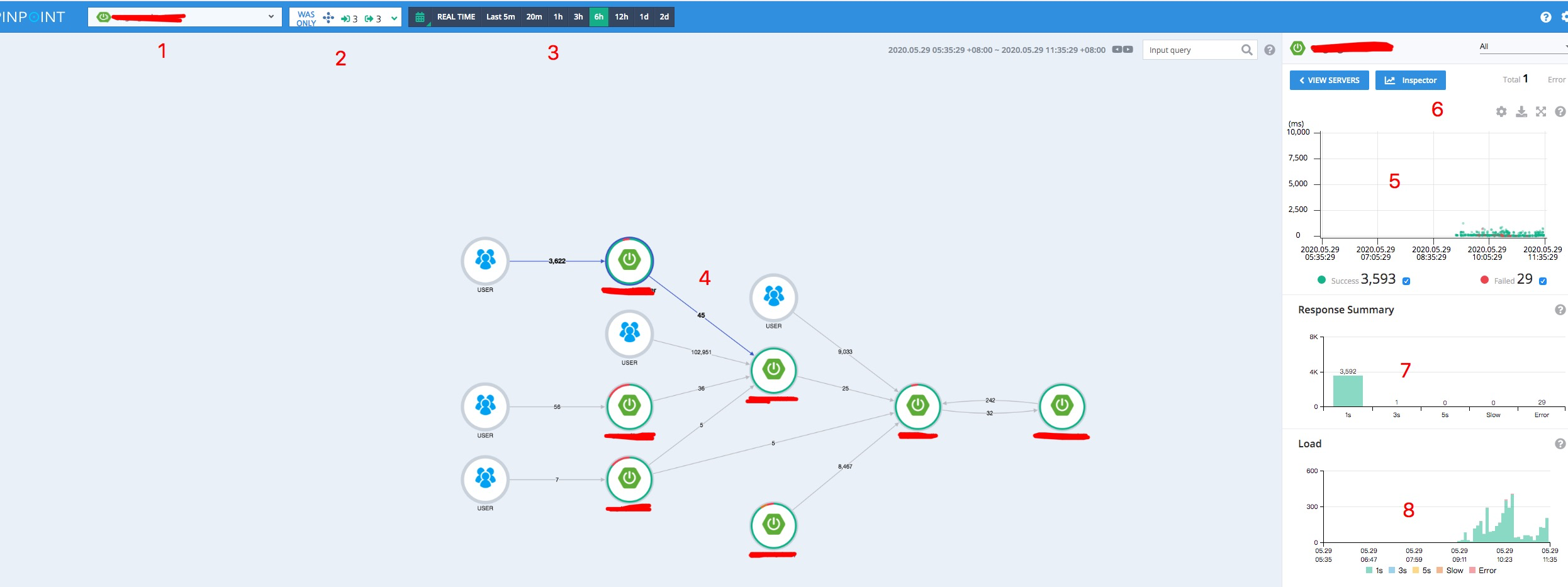 本文主要是针对pinpoint使用的说明,这里主要介绍一下pinpoint的功能,如何使用,每个功能的用处等等,下面是打开pinpoint的页面,页面中的各处功能,先用数字表示,图片下面会有注释。