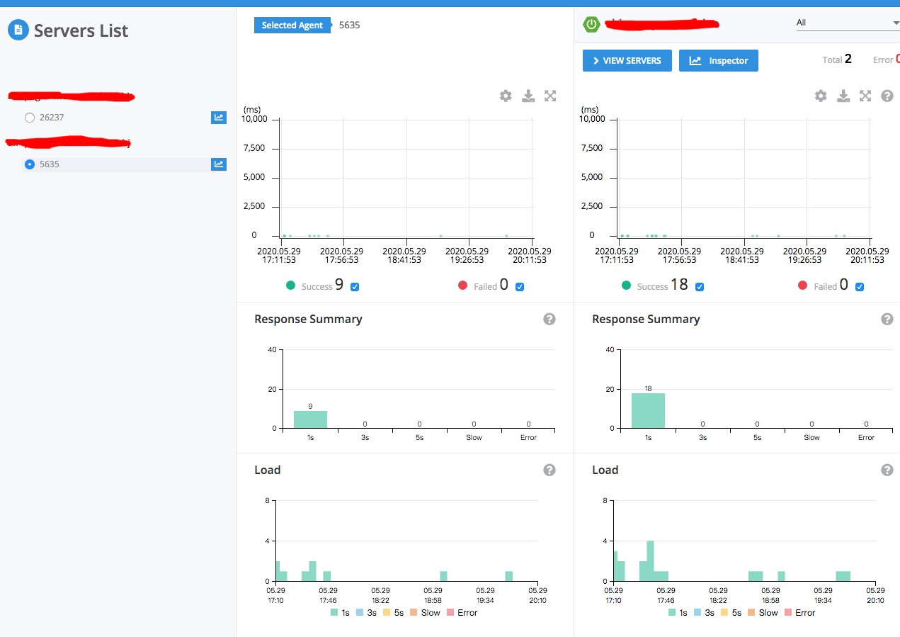 在首页的标注6里有两个选项,分别是VIEW SERVERS和Inspector。VIEW SERVERS展示的是在一个项目中运行在两台服务器上处理的请求对比。