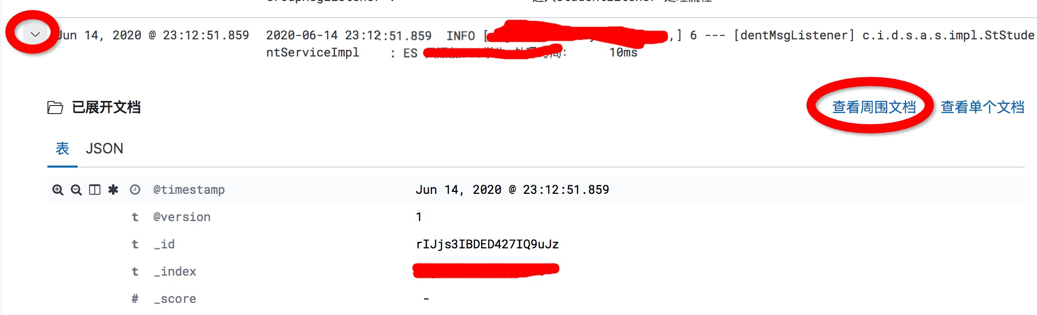 点击日志的箭头,找到查看周围文档,点击后默认是日志的上下5行的内容,可以自己进行修改。