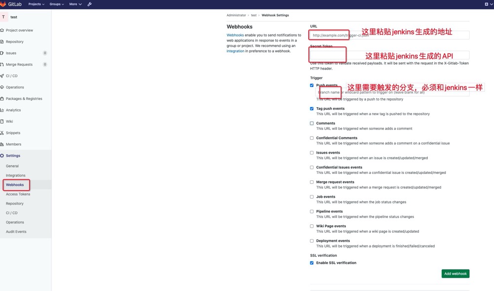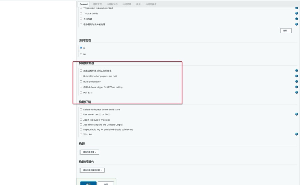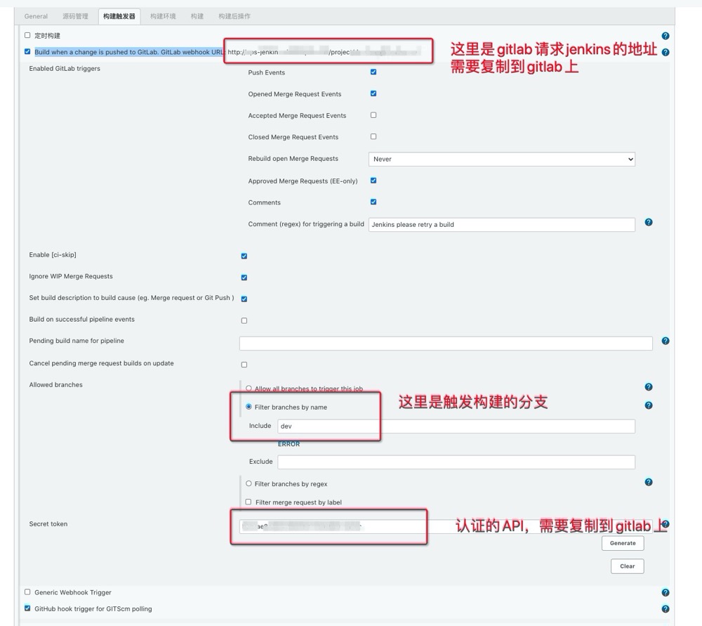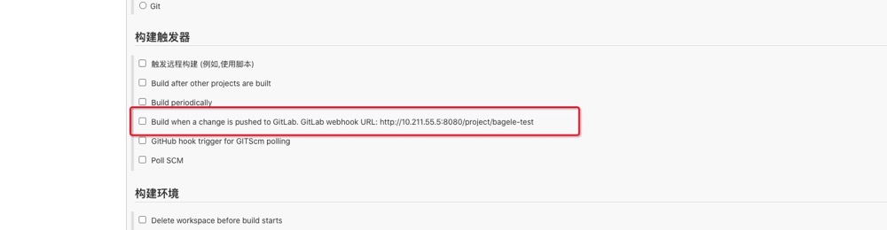 我们先在jenkins做构建,因为环境问题,我就拿公司里的环境做例子,其他不管,根据自己的环境做配置,只有自动触发,在触发构建了勾选Build when a change is pushed to GitLab. GitLab webhook URL和GitHub hook trigger for GITScm polling