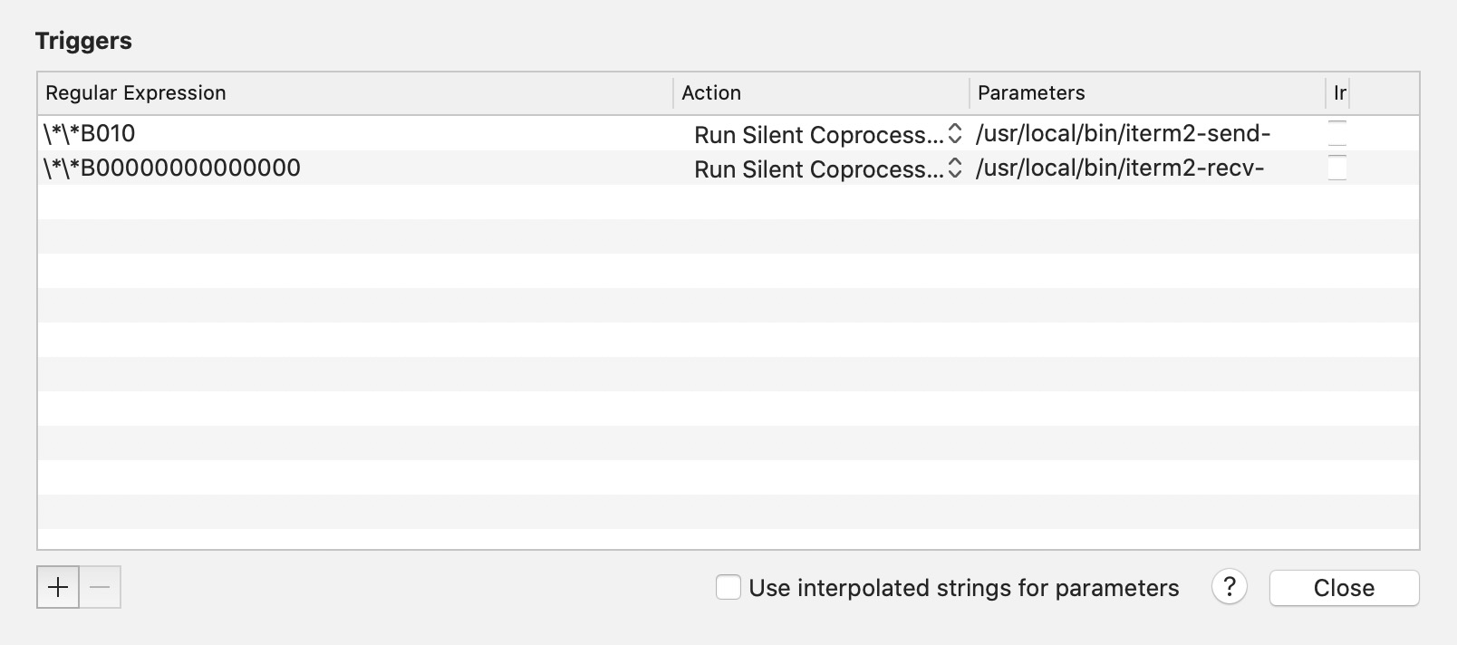 \*\*B010 Run Silent Coprocess /usr/local/bin/iterm2-send-zmodem.sh \*\*B00000000000000 Run Silent Coprocess /usr/local/bin/iterm2-recv-zmodem.sh
