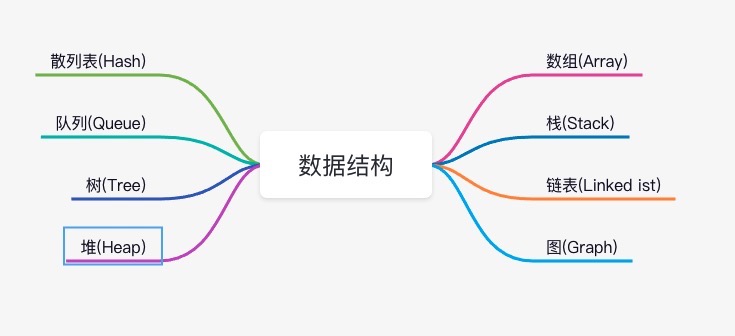 数据结构是指相互之间存在着一种或多种关系的数据元素的集合和该集合中数据元素之间的关系组成 。常用的数据结构有:数组,栈,链表,队列,树,图,堆,散列表等,如图所示: