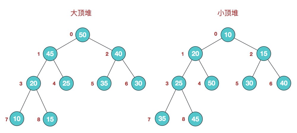 (ki <= k2i,ki <= k2i+1)或者(ki >= k2i,ki >= k2i+1), (i = 1,2,3,4…n/2),满足前者的表达式的成为小顶堆,满足后者表达式的为大顶堆,这两者的结构图可以用完全二叉树排列出来,示例图如下: