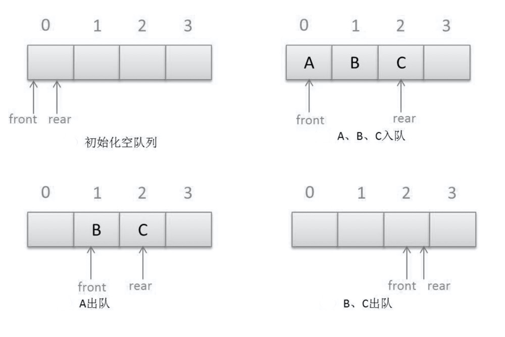 队列与栈一样,也是一种线性表,不同的是,队列可以在一端添加元素,在另一端取出元素,也就是:先进先出。从一端放入元素的操作称为入队,取出元素为出队,示例图如下: