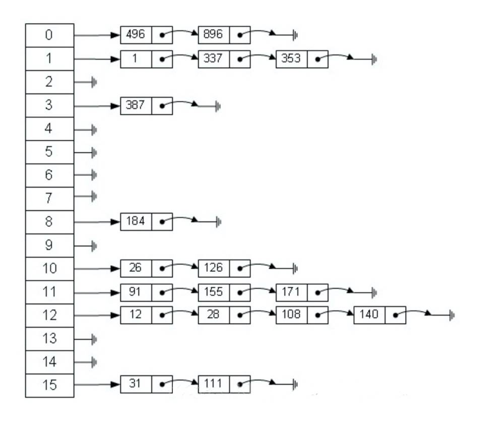 哈希表在应用中也是比较常见的,就如Java中有些集合类就是借鉴了哈希原理构造的,例如HashMap,HashTable等,利用hash表的优势,对于集合的查找元素时非常方便的,然而,因为哈希表是基于数组衍生的数据结构,在添加删除元素方面是比较慢的,所以很多时候需要用到一种数组链表来做,也就是拉链法。拉链法是数组结合链表的一种结构,较早前的hashMap底层的存储就是采用这种结构,直到jdk1.8之后才换成了数组加红黑树的结构,其示例图如下:
