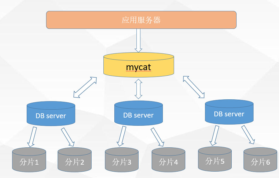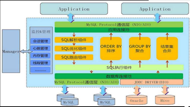 应用通过mycat请求sql--mycat拦截sql--解析sql--数据资源管理--数据源分配--请求/响应--结果整合