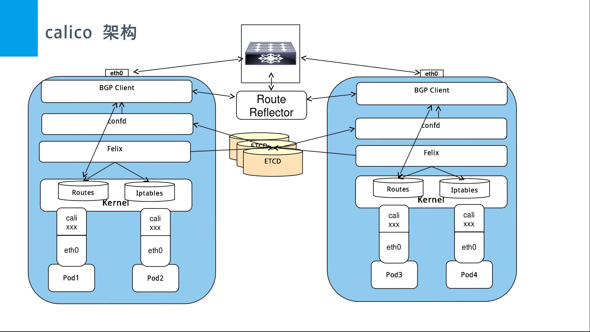 BGPRoute Reflector(BIRD), 大规模部署时使用,摒弃所有节点互联的mesh模式,通过一个或者多个 BGPRoute Reflector 来完成集中式的路由分发;