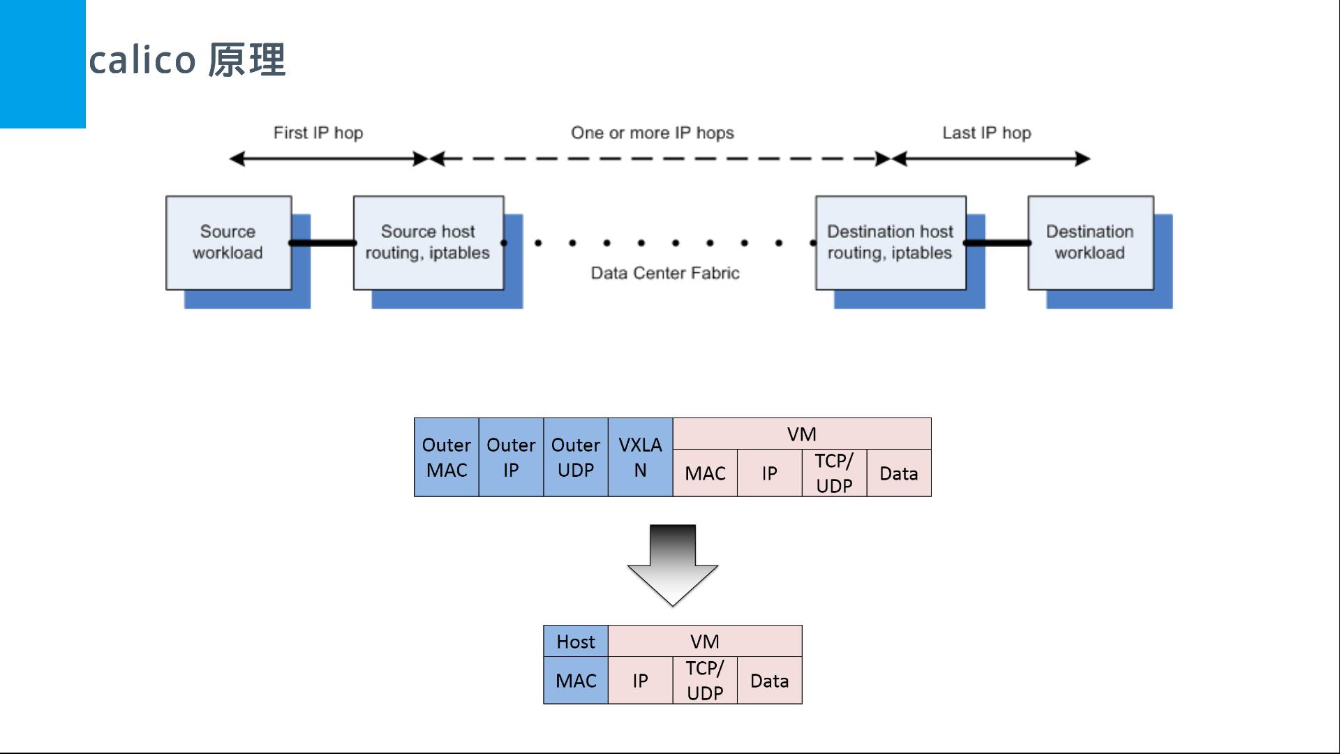 如下图所示,描述了从源容器经过源宿主机,经过数据中心的路由,然后到达目的宿主机最后分配到目的容器的过程。