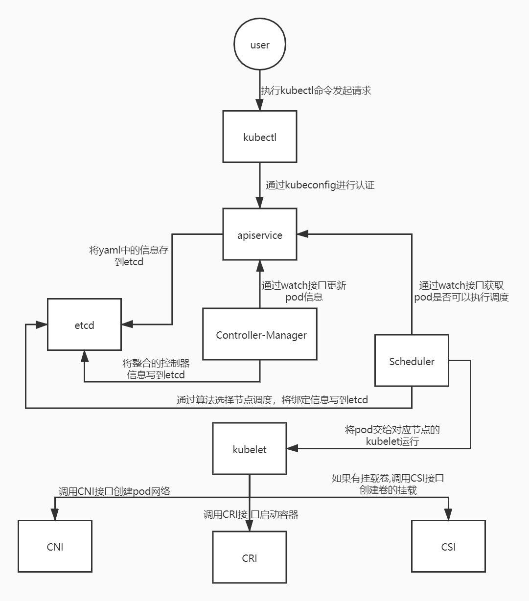 5.kubelet收到pod后,调用CNI接口给pod创建pod网络,调用CRI接口去启动容器,调用CSI进行存储卷的挂载。