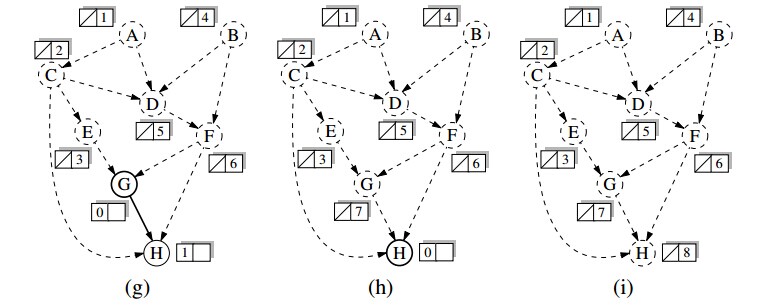 首先,对于每个顶点计算它的入度(入边的数量),将所有入度为0的顶点放入到一个队列中。当队列不空时,删除一个顶点v,并将与v相邻的所有顶点的入度