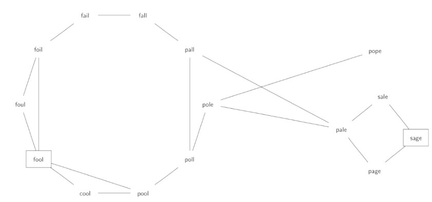 比如,一个word ladder problem,一次只变换一个字母,找出从fool到sage的最短路径。