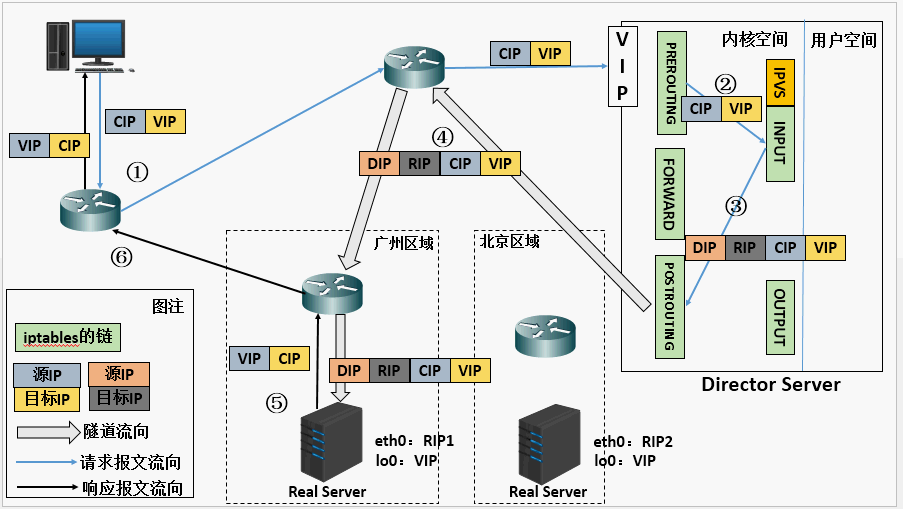 - POSTROUTING链根据最新封装的IP报文,将数据包发至RS(因为在外层封装多了一层IP首部,所以可以理解为此时通过隧道传输)。 此时源IP为DIP,目标IP为RIP。