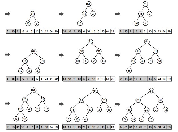 2.从堆末尾节点的父节点开始,向根的方向,依次执行下滤操作。总运行时间为O(N)。