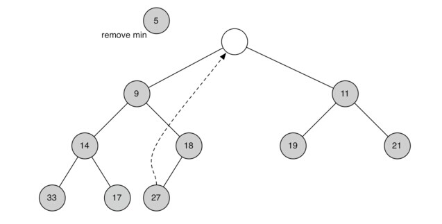 对于最小堆,删除根节点,将堆末尾的节点放到根部,然后执行下滤操作。操作的平均操作时间为O(logN)。