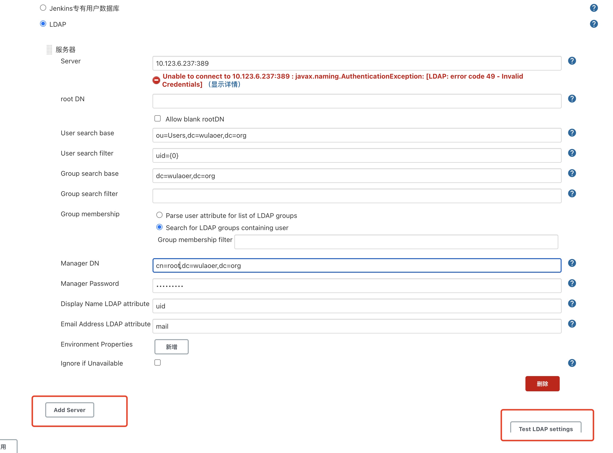 server配置的是ldap的服务IP和端口,这里因为我的ldap是错误的,只是举例,所以提示错误,但是这个不影响,如果你有自己的ldap,根据上面的提示配置即可,在添加之前可以先测试一下,测试通过后在添加,记住,添加后admin用户就不能使用了。