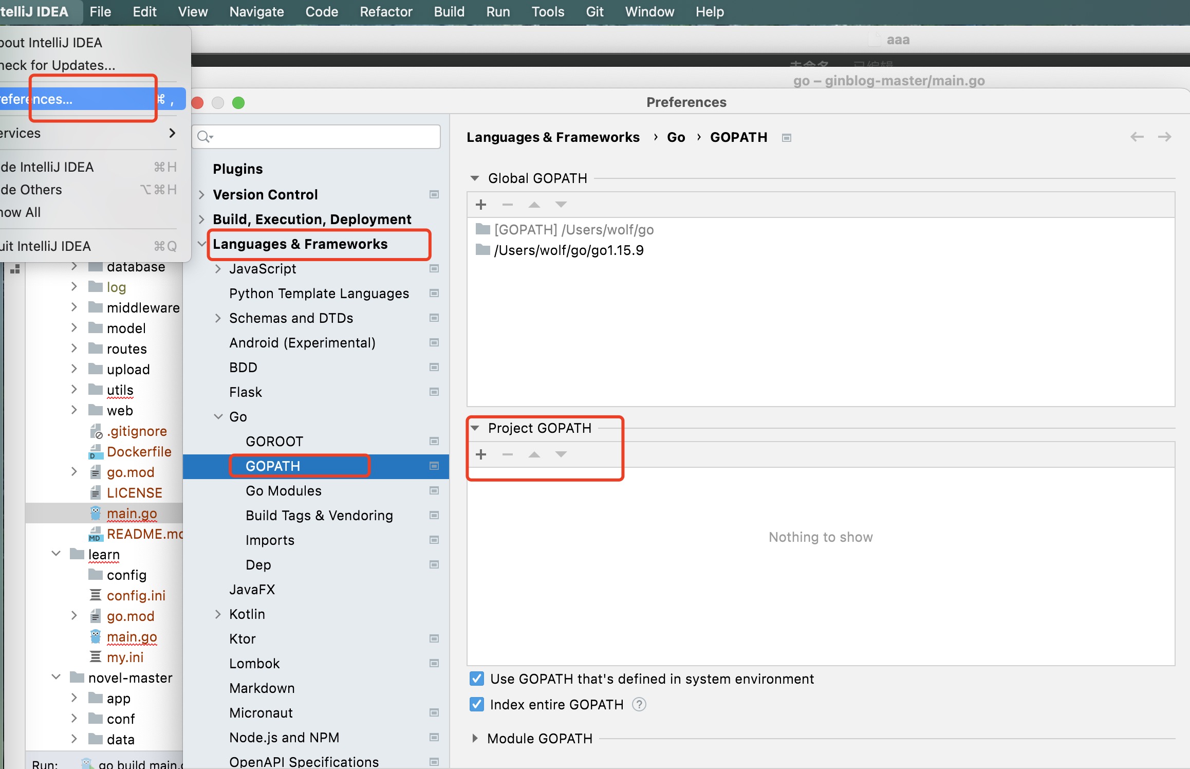 在这里项目路径没有,需要重新加一下项目路径,第一次是这样的,问题解决了,但是第二次的时候这个问题一直出现,不管怎么操作都不行,后来我把这个文件做个重命名,然后利用IDEA创建一个项目,然后在把重命名文件中的内容复制过来,问题解决,好像在Project GOPATH中也没有,而且在终端是可以执行的,在IDEA中执行不了,确认是IDEA的问题,后期如果有找到具体方法在说吧。