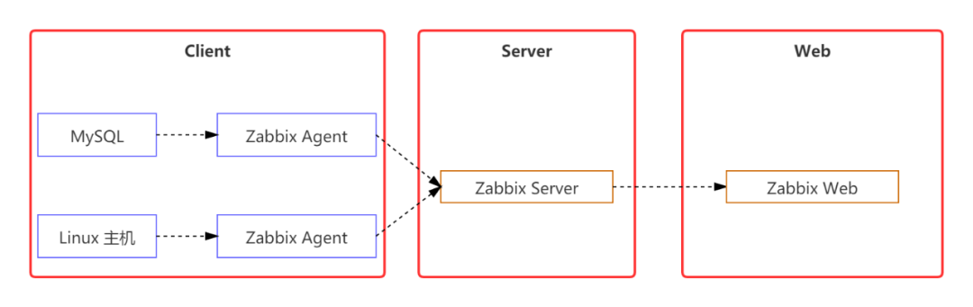 如上图,通过 Zabbix Agent 获取 MySQL 的监控数据(需要结合一些脚本和命令,在本节的后面会提到具体配置方法)。将获得的监控数据传到 Zabbix Server 中,最终通过 Zabbix Web 展示出来。