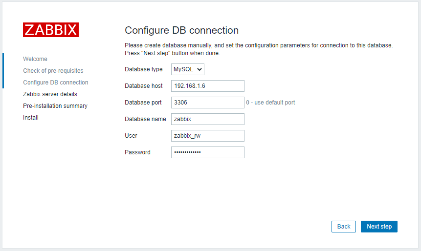 点击 “Next step”,可进入如下界面,修改 MySQL 的连接信息: