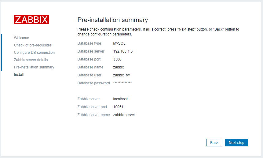 LogFile=/var/log/zabbix/zabbix_server.log LogFileSize=0 PidFile=/var/run/zabbix/zabbix_server.pid SocketDir=/var/run/zabbix DBHost=192.168.1.6 DBName=zabbix DBUser=zabbix_rw DBPassword=Zabbix@123456 SNMPTrapperFile=/var/log/snmptrap/snmptrap.log Timeout=4 AlertScriptsPath=/usr/lib/zabbix/alertscripts ExternalScripts=/usr/lib/zabbix/externalscripts LogSlowQueries=3000
