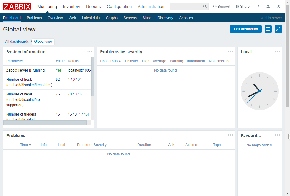 默认用户名为 Admin,密码为 zabbix。登陆后,可进入到 Zabbix 的主页面,如下图: