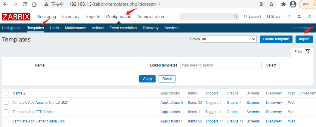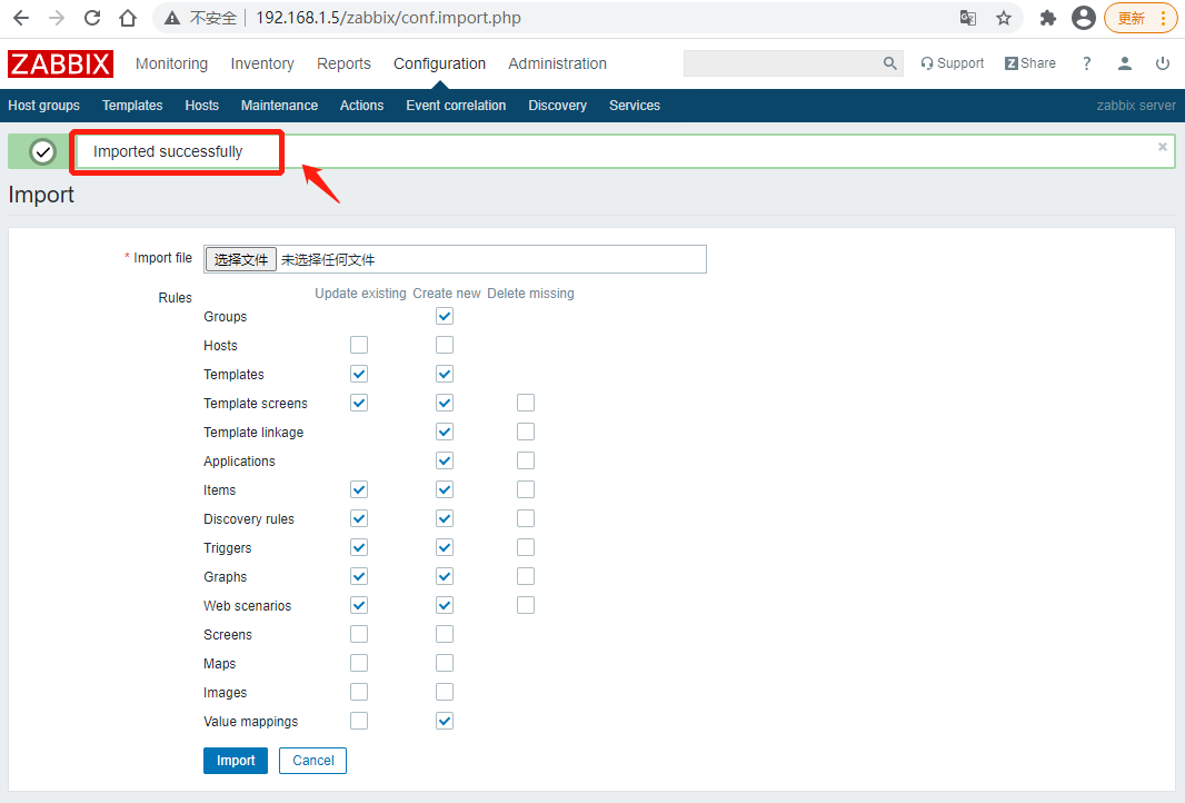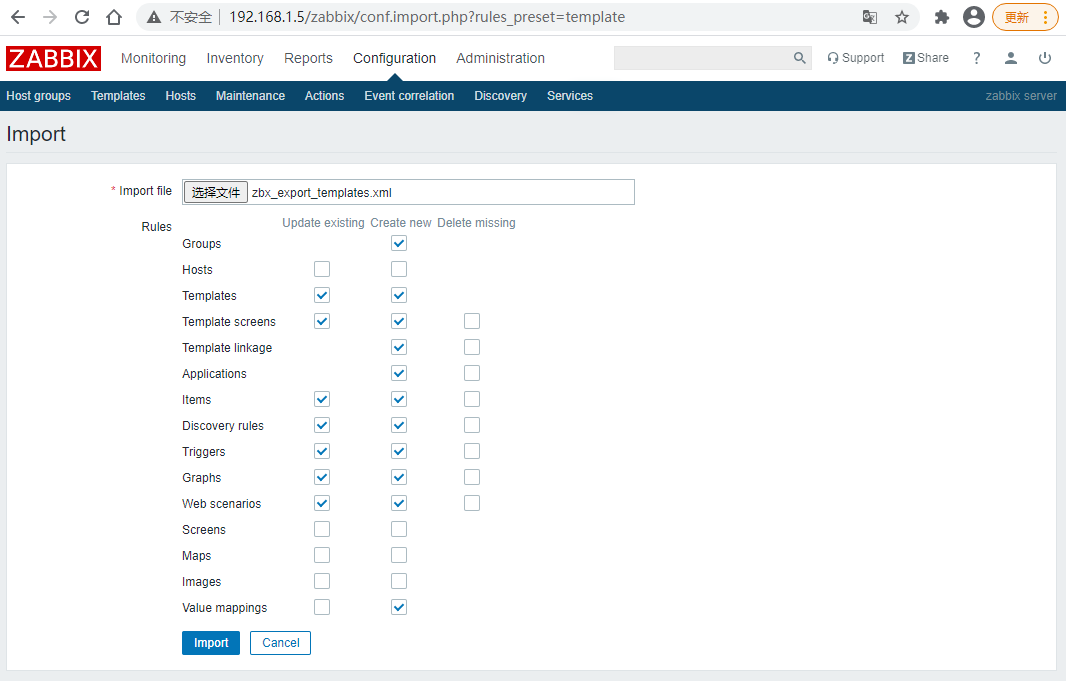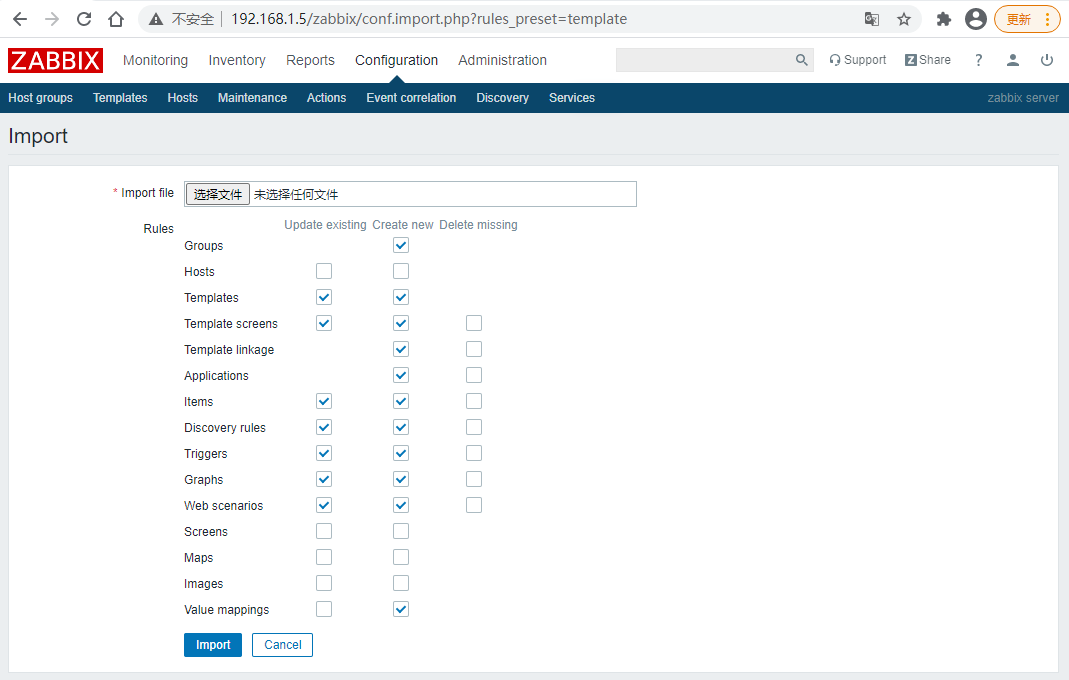 在 Zabbix 的 web 界面上,点击Configuration -> Templates -> Import 导入