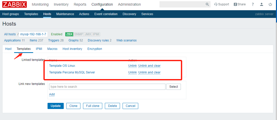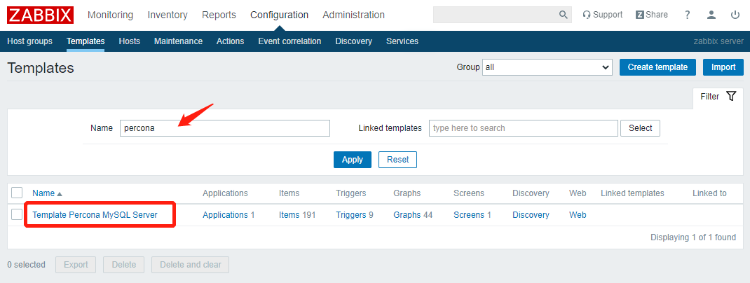 Configuration-->Templates,输入关键字 “percona”,则可以看到新导入的模板 “Template Perconal MySQL Server”: