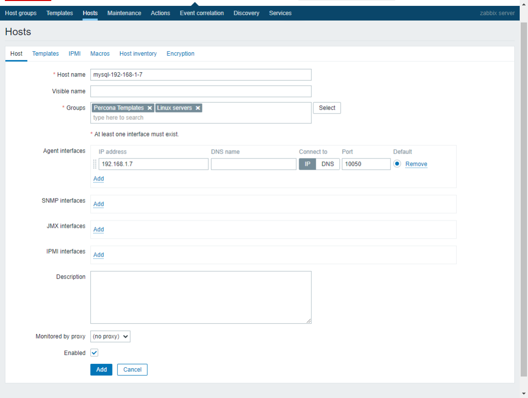 点击上图的“Create host”,进入下图,其中 Host name 填写被监控机器的可区分名字,Agent interfaces 中的 IP address 填被监控机器的 IP:
