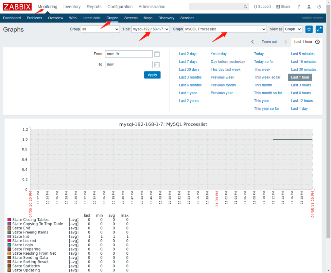 Monitoring-->Graphs,Host 选择这次新增的主机名,Graph 选择一个监控项,看是否有数据: