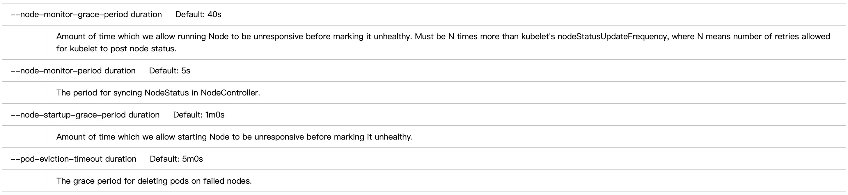 0、Master每隔一段时间和node联系一次,判定node是否失联,这个时间周期配置项为 node-monitor-period ,默认5s 1、当node失联后一段时间后,kubernetes判定node为notready状态,这段时长的配置项为 node-monitor-grace-period ,默认40s 2、当node失联后一段时间后,kubernetes判定node为unhealthy,这段时长的配置项为 node-startup-grace-period ,默认1m0s 3、当node失联后一段时间后,kubernetes开始删除原node上的pod,这段时长配置项为 pod-eviction-timeout ,默认5m0s