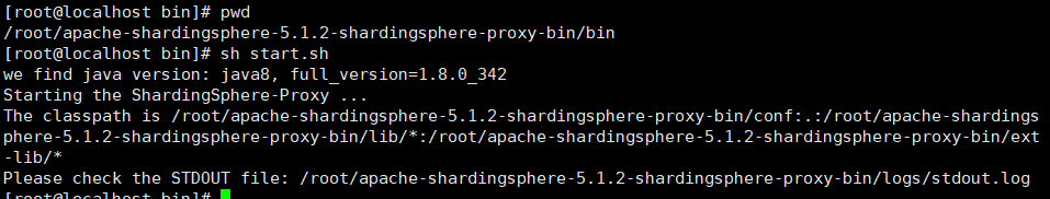 [root@localhost bin]# pwd /root/apache-shardingsphere-5.1.2-shardingsphere-proxy-bin/bin [root@localhost bin]# sh start.sh we find java version: java8, full_version=1.8.0_342 Starting the ShardingSphere-Proxy ... The classpath is /root/apache-shardingsphere-5.1.2-shardingsphere-proxy-bin/conf:.:/root/apache-shardingsphere-5.1.2-shardingsphere-proxy-bin/lib/*:/root/apache-shardingsphere-5.1.2-shardingsphere-proxy-bin/ext-lib/* Please check the STDOUT file: /root/apache-shardingsphere-5.1.2-shardingsphere-proxy-bin/logs/stdout.log