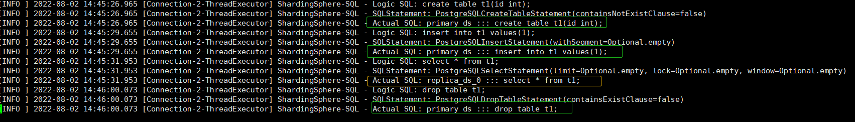 去查看ShardingSphere-proxy的输出日志,发现create、insert、drop的操作都是在主节点进行的,而select在备机节点执行。