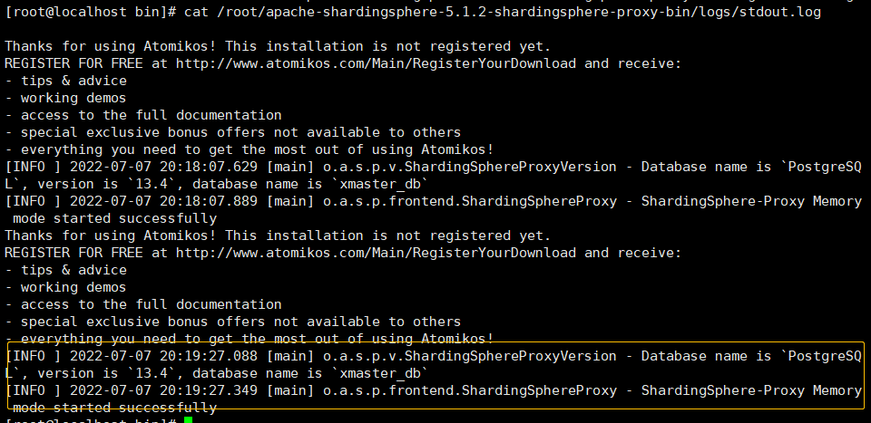 [root@localhost bin]# cat /root/apache-shardingsphere-5.1.2-shardingsphere-proxy-bin/logs/stdout.log Thanks for using Atomikos! This installation is not registered yet. REGISTER FOR FREE at http://www.atomikos.com/Main/RegisterYourDownload and receive: - tips & advice - working demos - access to the full documentation - special exclusive bonus offers not available to others - everything you need to get the most out of using Atomikos! [INFO ] 2022-07-07 20:18:07.629 [main] o.a.s.p.v.ShardingSphereProxyVersion - Database name is `PostgreSQL`, version is `13.4`, database name is `xmaster_db` [INFO ] 2022-07-07 20:18:07.889 [main] o.a.s.p.frontend.ShardingSphereProxy - ShardingSphere-Proxy Memory mode started successfully Thanks for using Atomikos! This installation is not registered yet. REGISTER FOR FREE at http://www.atomikos.com/Main/RegisterYourDownload and receive: - tips & advice - working demos - access to the full documentation - special exclusive bonus offers not available to others - everything you need to get the most out of using Atomikos! [INFO ] 2022-07-07 20:19:27.088 [main] o.a.s.p.v.ShardingSphereProxyVersion - Database name is `PostgreSQL`, version is `13.4`, database name is `xmaster_db` [INFO ] 2022-07-07 20:19:27.349 [main] o.a.s.p.frontend.ShardingSphereProxy - ShardingSphere-Proxy Memory mode started successfully