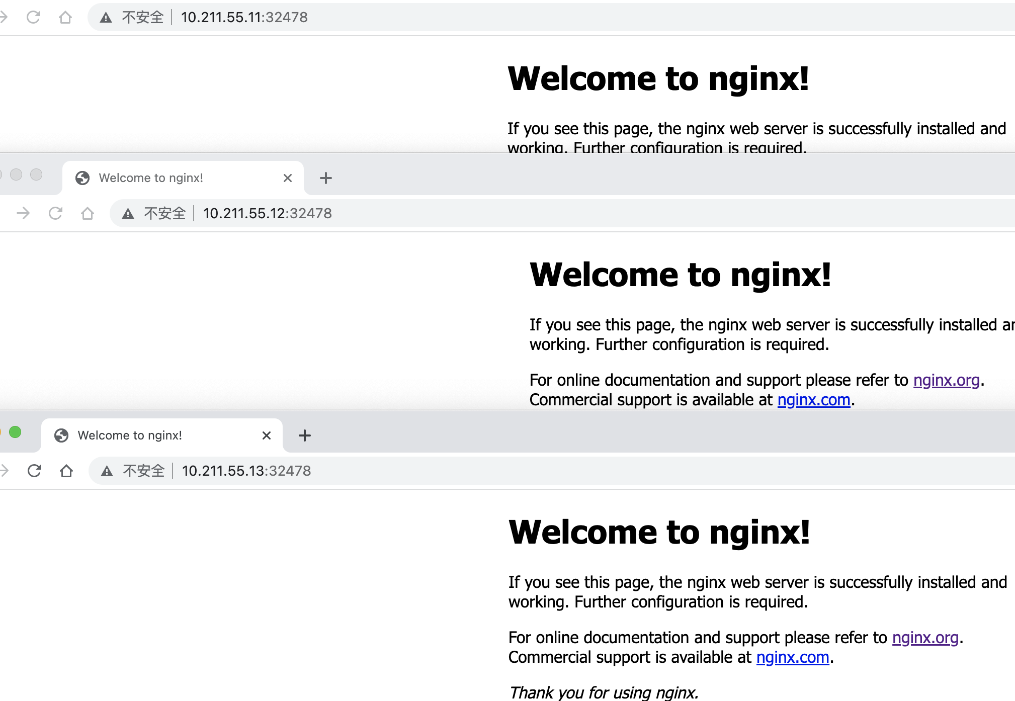 因为我这里没有负载均衡,所以使用的是NodePort的方式进行访问,NodePort访问是可以通过所有的宿主机的IP加上固定端口请求的,看下面的示例。