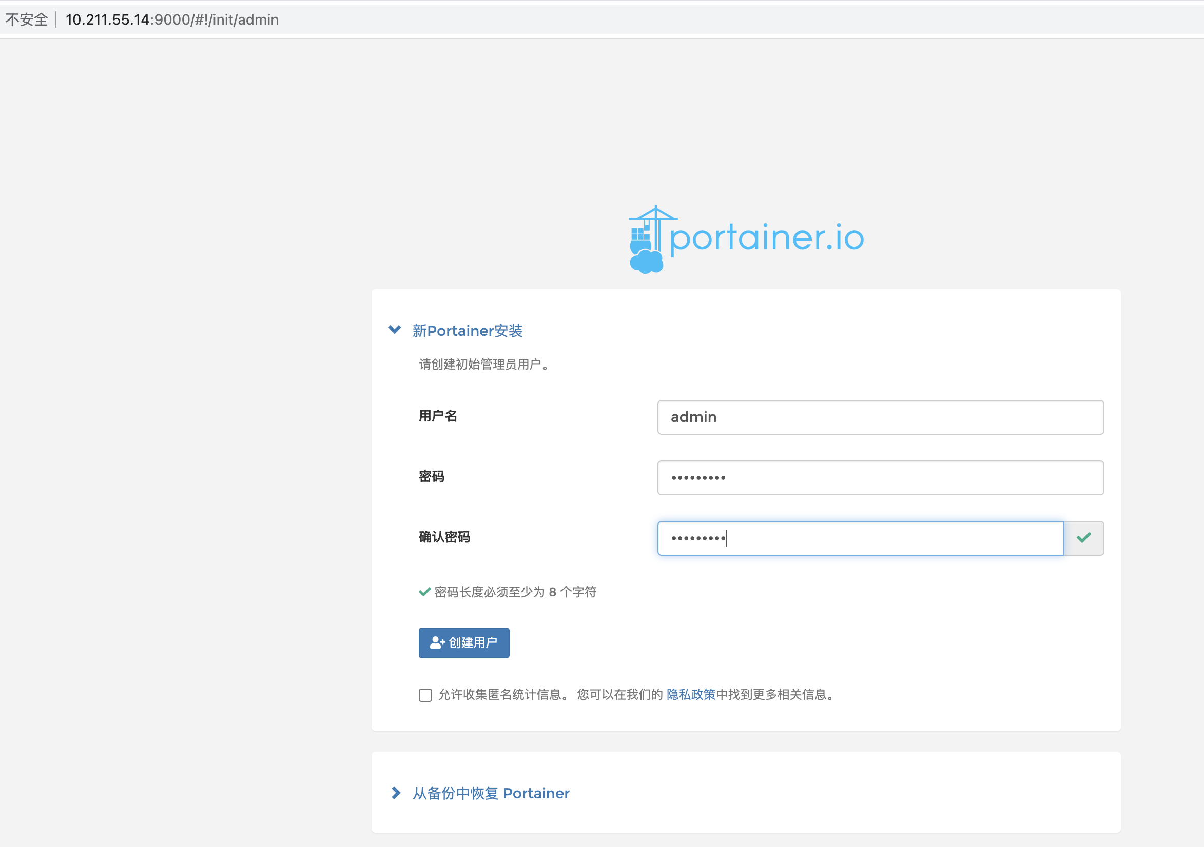 输入管理员密码,这里是创建密码,至少8位长度。如果自己有备份可以恢复。安装好后可以选择环境,