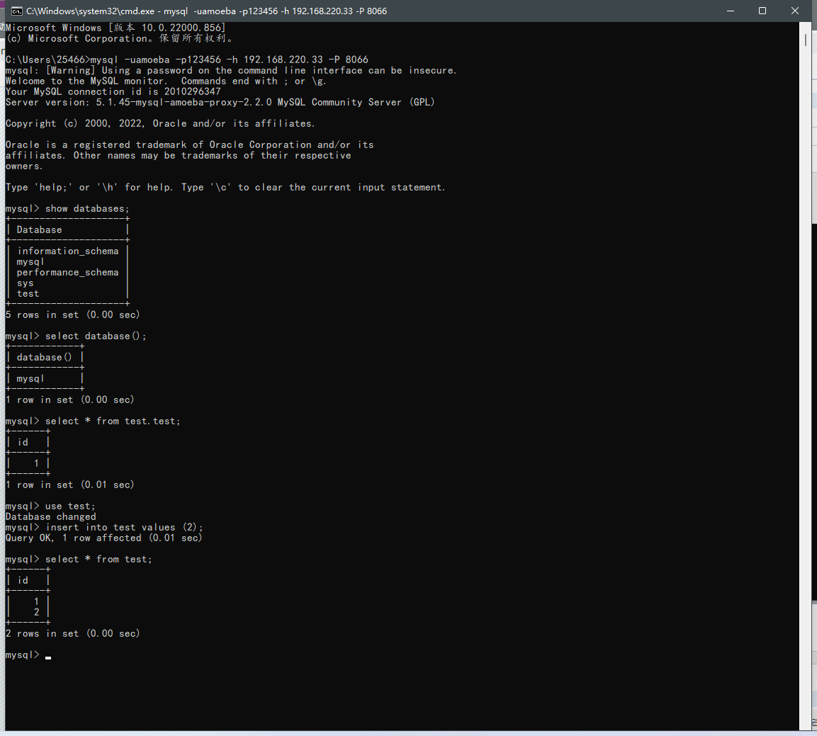mysql> grant all on *.* to 'test'@'192.168.220.%' identified by '1234.Com'; #创建授权用户 为amoeba提供登录