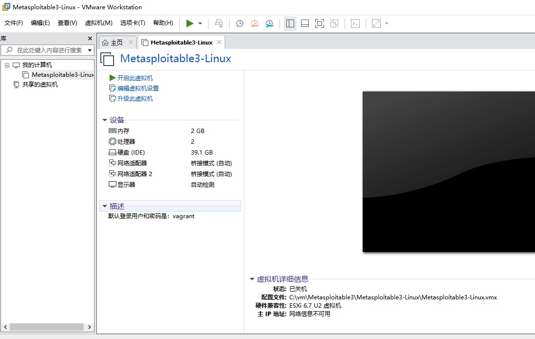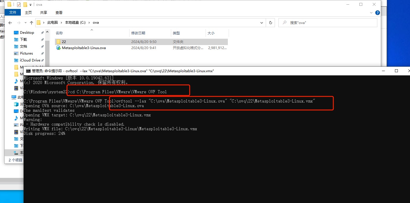 其中: C:\Program Files\VMware\VMware OVF Tool这个路径是转换工具的安装路径,因为没有配置环境变量直接在安装所在目录执行,ovftool --lax "C:\ova\Metasploitable3-Linux.ova" "C:\ovq\22\Metasploitable3-Linux.vmx"前面的参数不变,第一个路径是转换前的路径,第二个是转换后的。转换成功后,会有两个文件,分别是vmx和vmdk两个后缀的文件,然后把这两个文件copy到mac里,通过parallels打开,