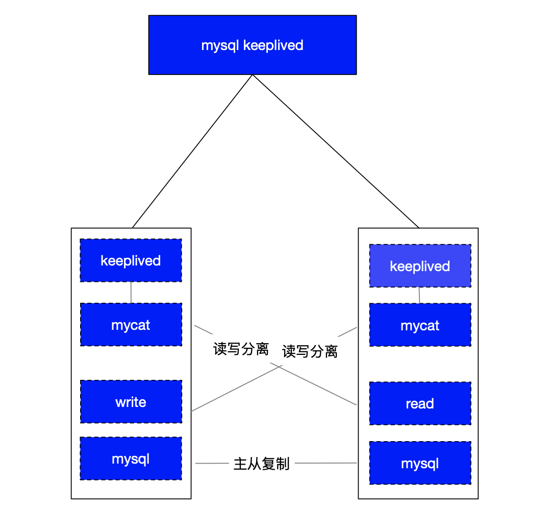 keeplived做反向代理,转发到两个mycat中间件上,在两个mycat上做了读写分离配置,分别写入到主库,从从库读取数据库信息.