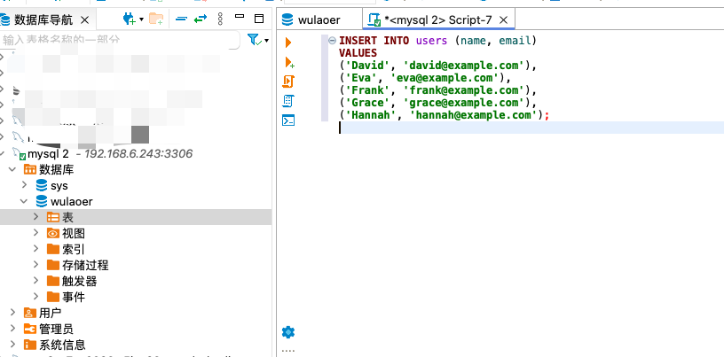 mysql> use wulaoer; Database changed mysql> CREATE TABLE users ( -> id INT AUTO_INCREMENT PRIMARY KEY, -> name VARCHAR(100) NOT NULL, -> email VARCHAR(100) NOT NULL UNIQUE, -> created_at TIMESTAMP DEFAULT CURRENT_TIMESTAMP -> ); Query OK, 0 rows affected (0.02 sec)  mysql> INSERT INTO users (name, email) -> VALUES -> ('Alice', 'alice@example.com'), -> ('Bob', 'bob@example.com'), -> ('Charlie', 'charlie@example.com'); Query OK, 3 rows affected (0.00 sec) Records: 3 Duplicates: 0 Warnings: 0