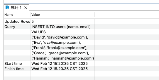 mysql> SELECT * FROM wulaoer.users; +----+---------+---------------------+---------------------+ | id | name | email | created_at | +----+---------+---------------------+---------------------+ | 1 | Alice | alice@example.com | 2025-02-12 11:45:32 | | 2 | Bob | bob@example.com | 2025-02-12 11:45:32 | | 3 | Charlie | charlie@example.com | 2025-02-12 11:45:32 | | 4 | David | david@example.com | 2025-02-12 15:20:36 | | 5 | Eva | eva@example.com | 2025-02-12 15:20:36 | | 6 | Frank | frank@example.com | 2025-02-12 15:20:36 | | 7 | Grace | grace@example.com | 2025-02-12 15:20:36 | | 8 | Hannah | hannah@example.com | 2025-02-12 15:20:36 | +----+---------+---------------------+---------------------+ 8 rows in set (0.00 sec)