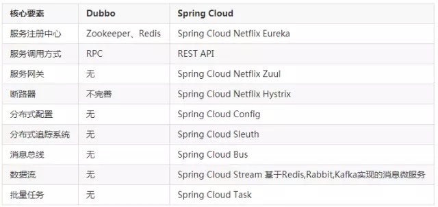 可以看出,Spring Cloud 比较全面,而 Dubbo 由于只实现了服务治理,需要集成其他模块,需要单独引入,增加了学习成本和集成成本。