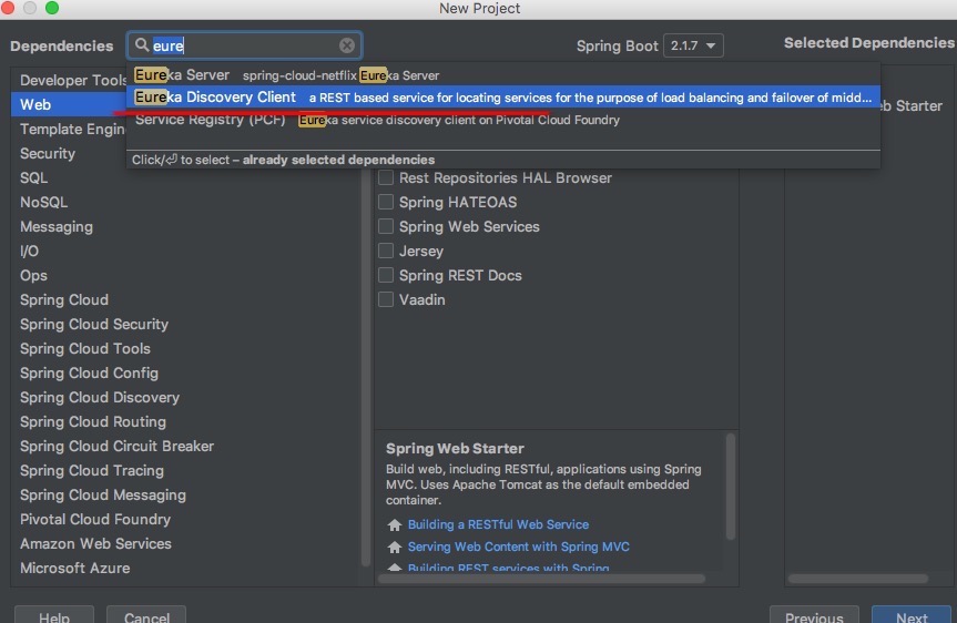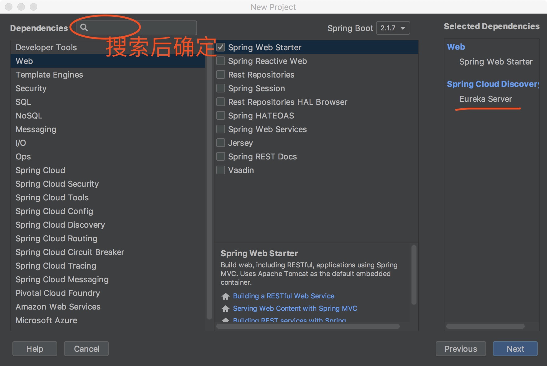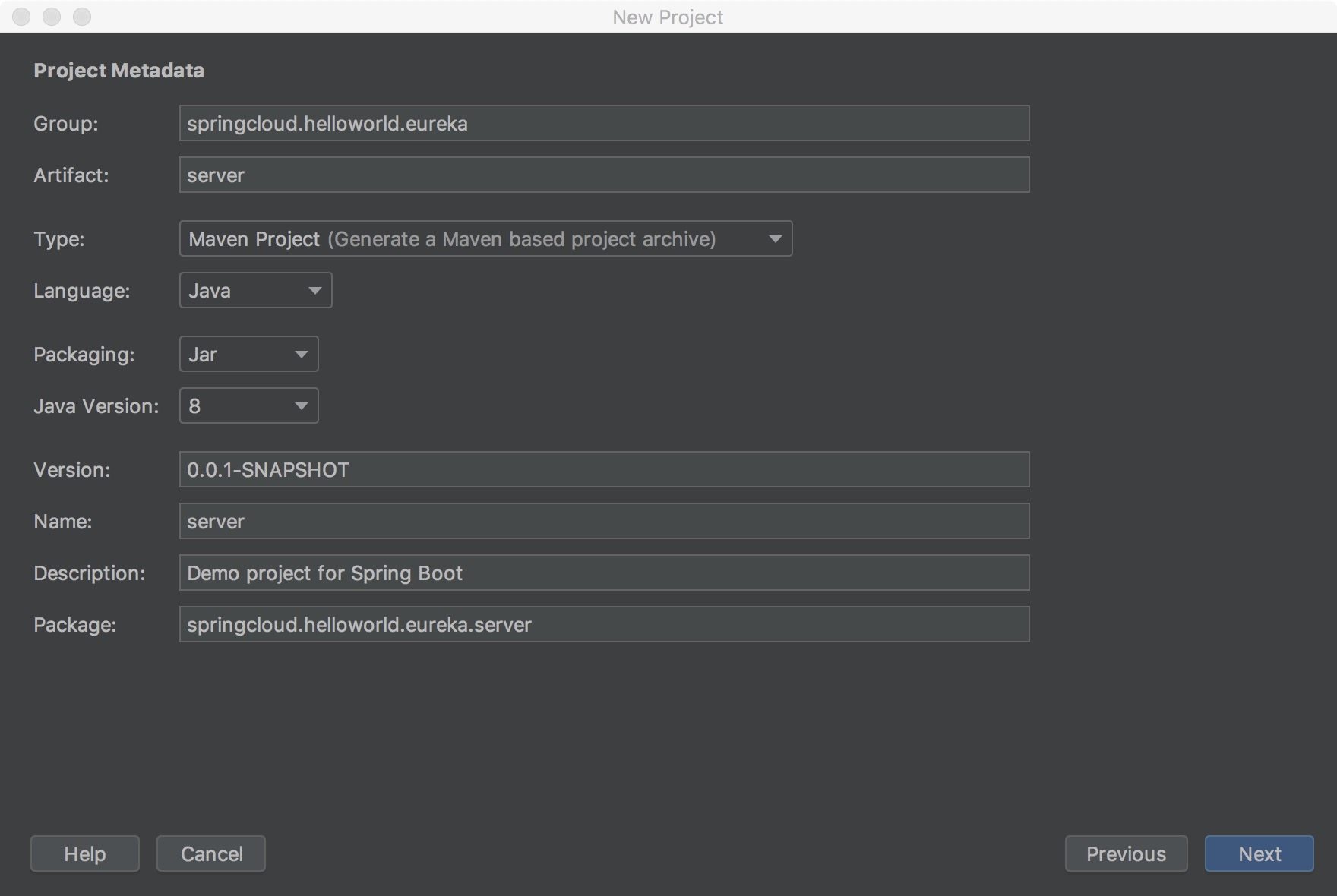 创建Spring Boot服务端,给项目命一个名字为springcloud.helloworld.eureka.server,下面是创建流程: