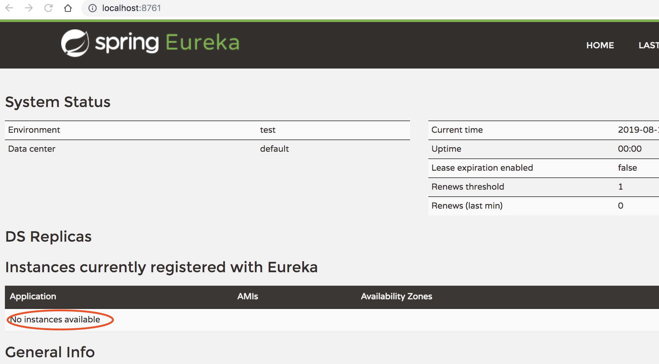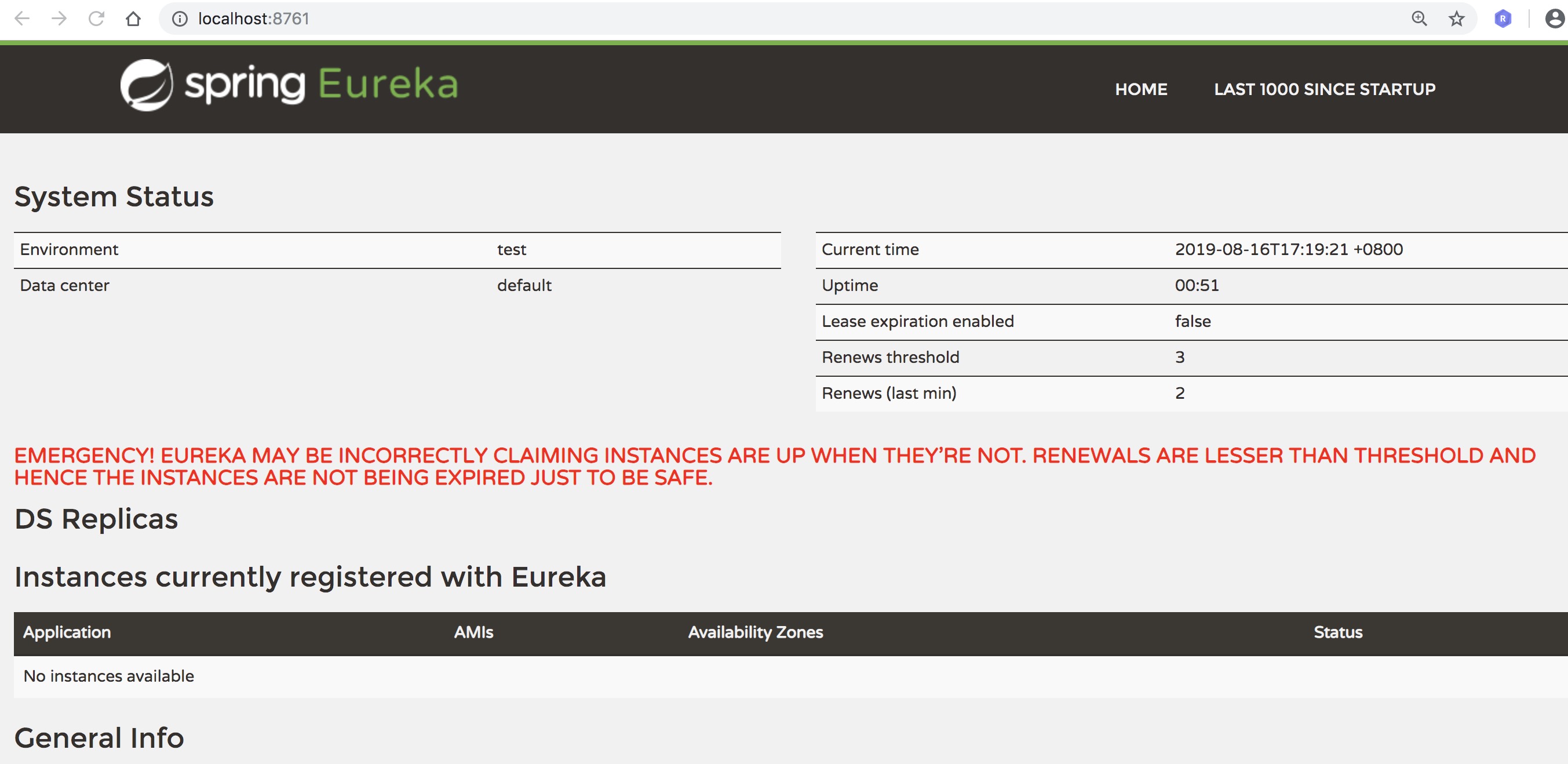 5、启动eureka server,右键ServerApplication--run,然后访问http://localhost:8761/,页面如下,“No instances available”表示无client注册