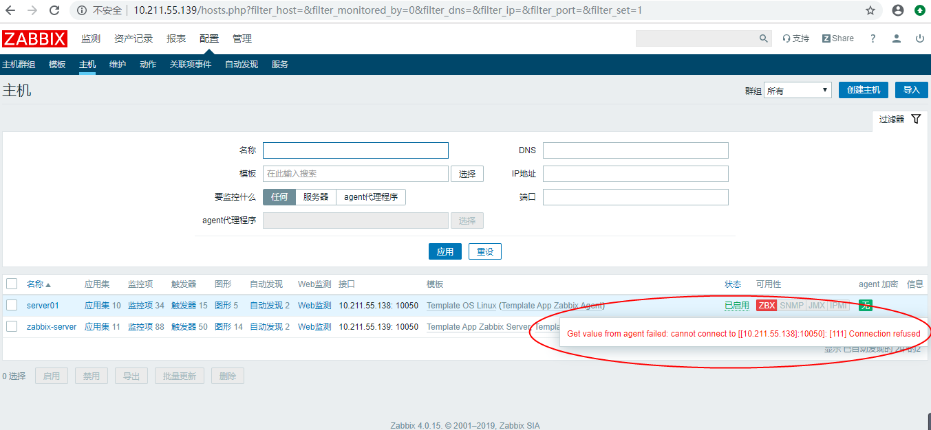 Get value from agent failed: cannot connect to [[10.211.55.138]:10050]: [111] Connection refused